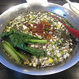 「豚骨黒胡麻担々麺」が出される前に、高菜漬け、キムチ、ザーサイとスープを持ってきて食べました。高菜漬け、キムチ、ザーサイのいずれも美味しかったです。