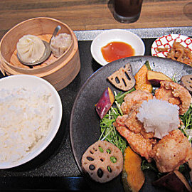 14分後にご飯と、レンコンのシューマイと小籠包、おろし油淋鶏、揚げ根菜、ザーサイが出されました。