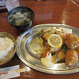 たぬき定食には、白身魚のフライと鶏のから揚げ、野菜サラダ、味噌汁、ごはんが付いていました。