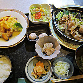 おまかせコースAには、豚肉のすき焼き風煮物、魚とムール貝の玉子黄身焼きバターソース、野菜サラダ、里芋の煮物、みそ汁、ご飯、そのほか小鉢2品がついていました。