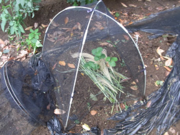 初生葉(3日ほど)が出るまでは鳥に食べられやすいのでネットをかける。