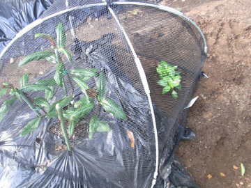 苗を日よけや虫よけ、防風のために肥料の袋をかけました。