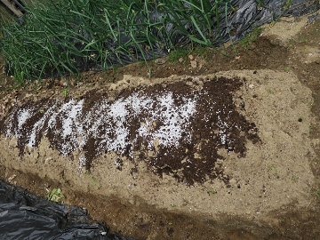 貝殻有機石灰粉状(150~200g/㎡)を撒いて、周辺を掘って畝を作り、掘った土は石灰にかぶせました。