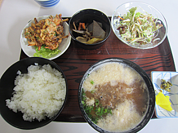 牛汁って、少量の牛こま切れと目玉焼きととろろ芋が入った醤油と生姜味のめった汁でした。