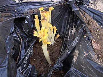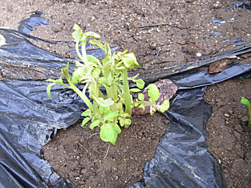 知らないうちに、芽が成長していていたので、芽が出ている箇所の黒マルチを切り抜いておいた。